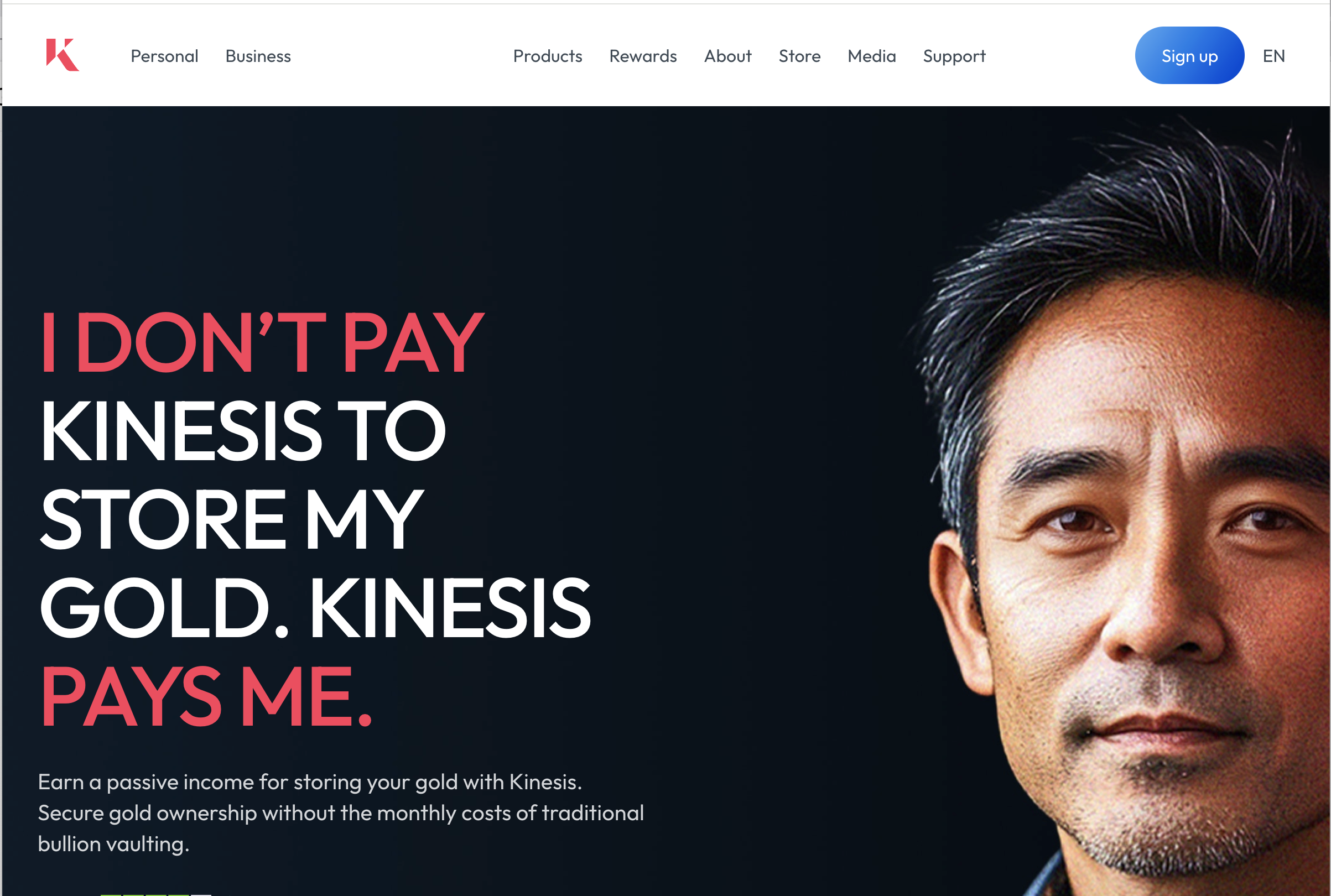 Kinesis.Money features a polished, professional website with a modern user interface. Key sections highlight: